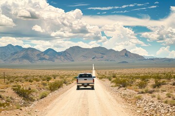 Pickup truck driving through desert towards mountains on straight road
