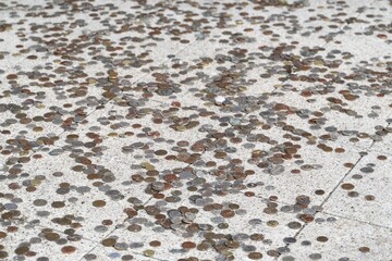 Coins scattered on stone floor, sacrifice, Japanese Gateway or Japanese Tor tor, Royal Botanic Gardens (Kew Gardens), UNESCO World Heritage Site, Kew, Greater London, England, United Kingdom