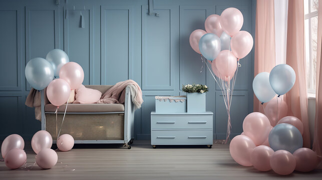 Charming pastel pink room setup with balloons and vintage chest, ideal for baby shower, birthday party, or celebration. Blank wall provides space for text or design.