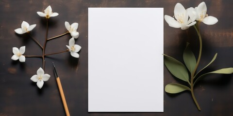 Botanical invitation card mockup with front sides, top view with copy space. Wedding stationery invitation card mockup and decor. Baby shower o bridal shower. Minimal blank, thank you greeting card,