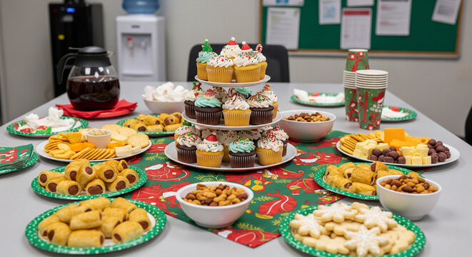 Festive office Christmas party spread with cupcakes, pastries, and snacks.