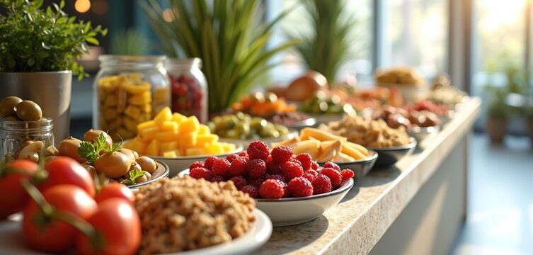 Healthy Breakfast Buffet: A vibrant spread of fresh fruits, granola, and greens on a modern buffet table. Nutritious start to the day!