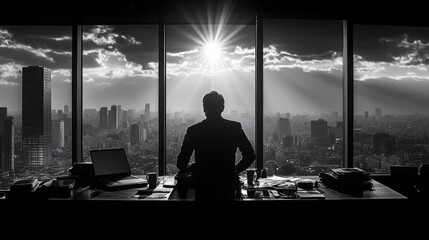 Silhouette of a stressed office worker with a laptop at a desk, highlighting the pressure and challenges of modern work environments.