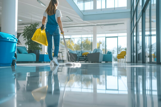 Office cleaning, mop for cleaning and clean floor. concept template for advertising cleaning, office cleaning, sanitary conditions with space for text