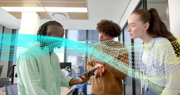 Smiling woman tapping tablet in coworking space with digital data overlay for teamwork