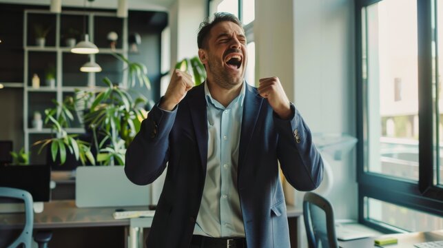 Professional team celebrating successful project milestone, sharing joyful moment of unity and laughing together in modern office workspace, highlighting collaborative workplace achievement