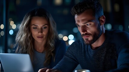 Business professionals working late on laptop computer in modern office with city lights background at night.