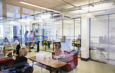 Blurred background of a business meeting in a modern office with people sitting at a table, a team working together having a discussion. View through a glass wall