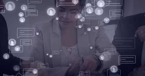 Smiling friendly African American therapist in glasses talking on video call, using sign language, speaking to patient with hearing disability, deafness, showing gestures at screen