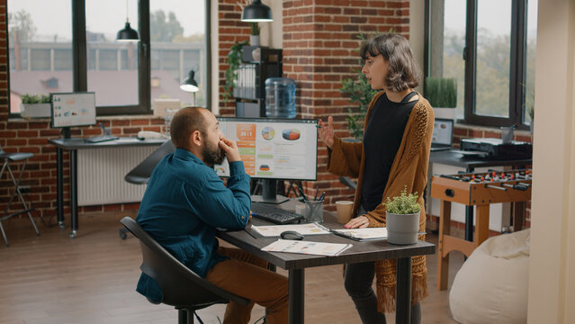 Workmates looking at monitor with data rate charts to plan project and marketing strategy. Colleagues working with computer to create data analysis on display for business presentation