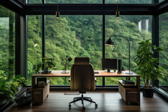Step into an enchanting forest green office interior, where nature meets productivity, creating a serene oasis that boosts creativity and rejuvenates with its calming greenery, natural light