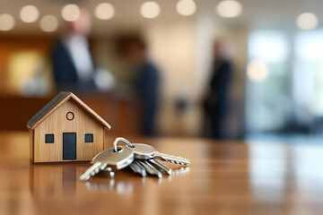 A model house with keys on a wooden table, symbolizing real estate and new beginnings in a modern office environment.