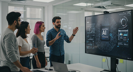 Male office worker analyzing digital graphs in modern workspace, collaboration insight