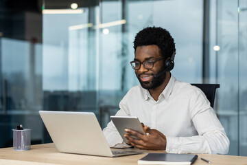Businessman using digital checklist application on tablet and laptop for online survey and task management, business concept with modern technology