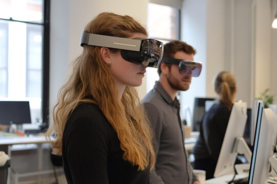Colleague using virtual reality headset in modern office environment