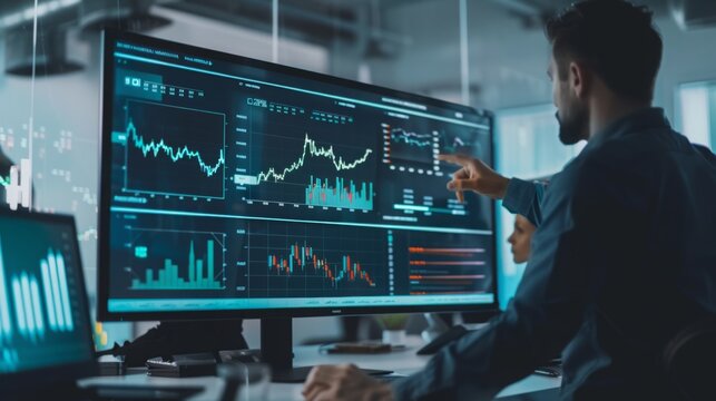 Financial analyst studying market data on desktop with candlestick chart overlay in office