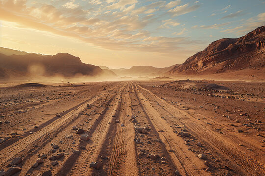 Safari and travel to Africa, extreme adventures or science expedition in a stone desert. Sahara desert at sunrise, mountain landscape with dust on skyline, hills and traces of the off-road car