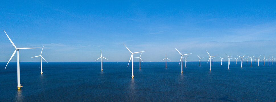 offshore windmill park and a blue sky, windmill park in the ocean. Netherlands Europe. windmill turbines in the Noordoostpolder Flevoland