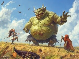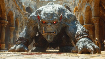 Stone Ogre menacingly crouches in ancient ruins, background figures fleeing; fantasy game art