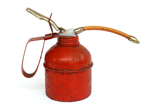 Plastic jerry can for engine oil isolated on black background. Mock-up.