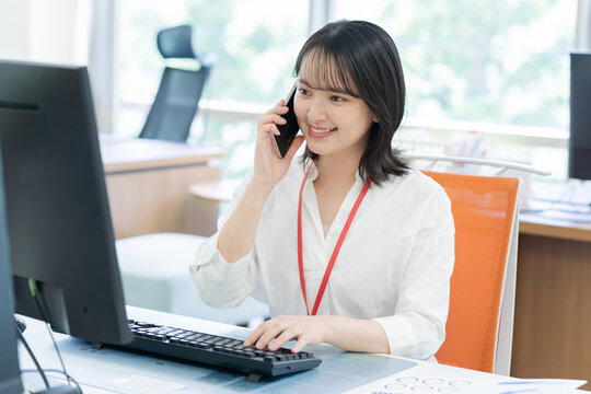 パソコンを持ってオフィスの廊下を歩くビジネスウーマン 転職や採用などの明るいイメージに