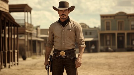 A confident cowboy stands in the dusty streets of an old western town during sunset