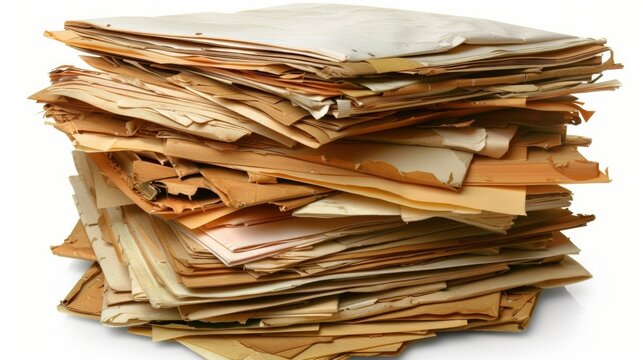Stacks of old documents fill abandoned archive room shelves. Dusty papers organized in messy piles suggest forgotten history and nostalgic decay. Retro storage space shows aged records and paperwork.