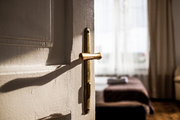 old metal doorknob on an ornate wooden door inside a church in Brazil