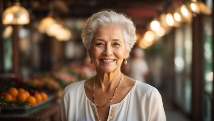portrait of beautiful middle aged elderly senior model woman with grey hair. She smiling and healthy woman.