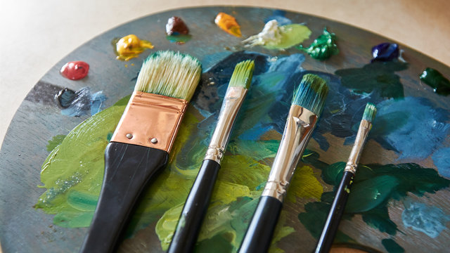Old Paintbrushes On Dirty Palette In Workshop Images