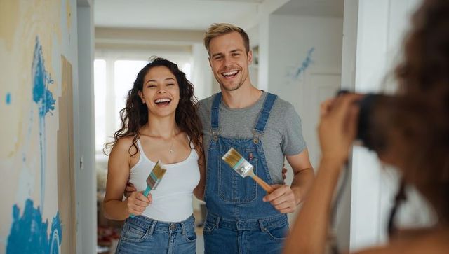 Cheerful couple renovating home together with paintbrushes