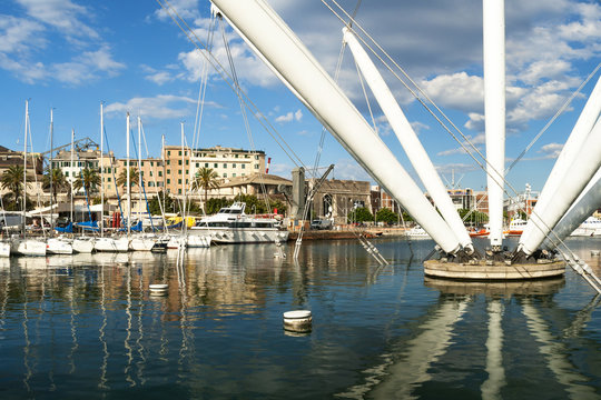 Genova, Italy - 11/25/2019: An amazing caption of the sunset in winter days over the sea of Genova with beautiful red and blue sky, some amazing clouds in the background and old rocks over the sea.