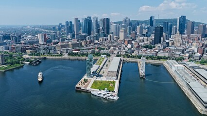 Aerial view of Old Port of Montreal and downtown skyline panorama in summer dusk. Quebec, Canada.