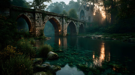 Historic stone viaduct amidst misty landscape