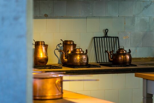 antique teapots in an old house