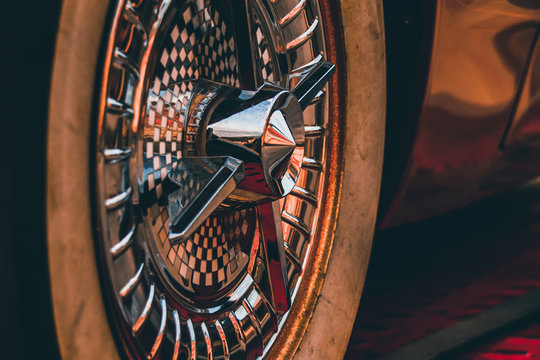 Vintage old timer car tire to show a 1920`s cinematic moody theme and nostalgia for the elegant and classic era