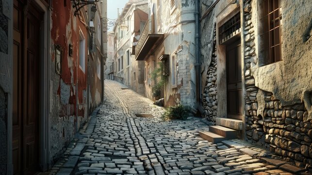 Tourists strolling cobblestone street in historic european town with fountain and church