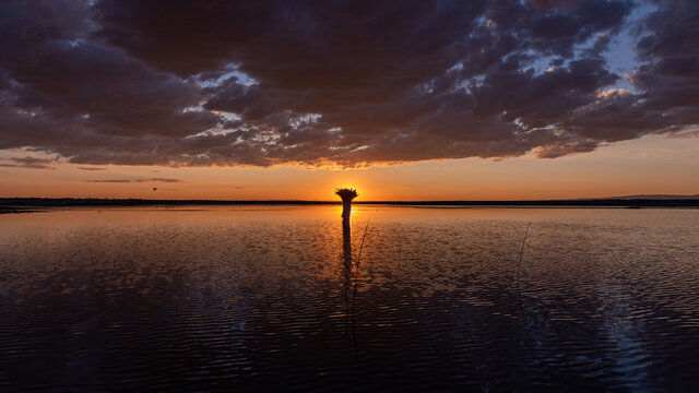 Scenic sunset over a lake with clouds reflection on a calm water surface, South East of Oregon. A trunk of an old broken tree against setting sun