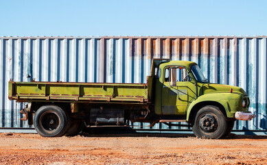 Vintage red barn with abandoned truck in a farmyard on the prairies in Saskatchewan