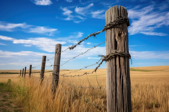 Prairie and blue skies backdrop with wooden post and barbed wire