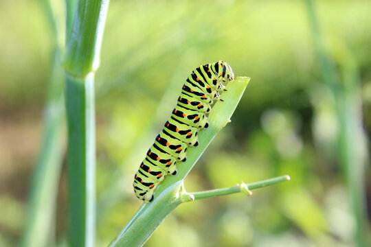 Caterpillar of The Old world swallowtail (Papilio machaon) crawling and feeding on stem of a fennel, close up, natural conditions in garden.
