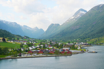 Norway, Olden village and fjord landscape