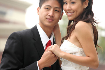 Older chinese bride and groom at altar at wedding. Happy couple excited smile for wedding, happiness and marriage. Generative AI