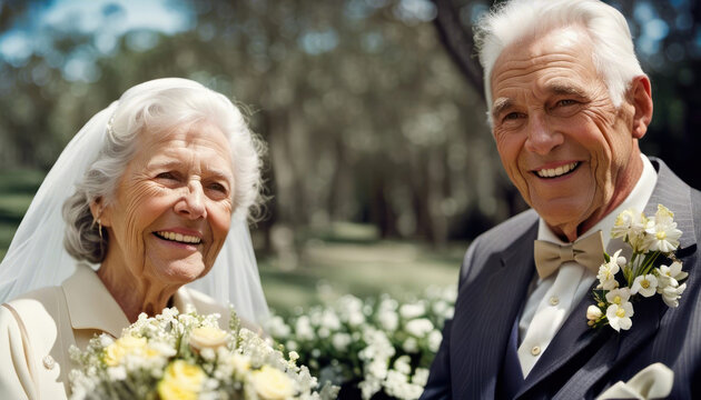 Mature couple getting married. Close-up of elderly bride in white dress, groom blurred in background.