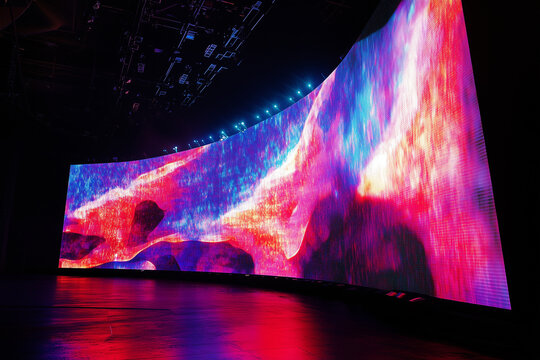 Futuristic conference stage with central display and lighting