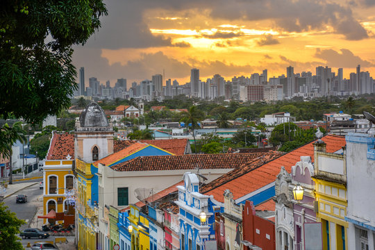The historic architecture of Olinda in Pernambuco, Brazil with its colonial buildings and cobblestone streets at sunset.