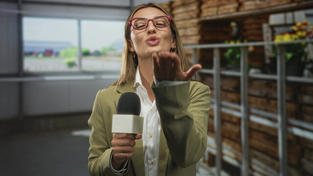 Woman reporter holding microphone, smiling and blowing a kiss to camera in a studio with red glasses and olive blazer; playful charm.