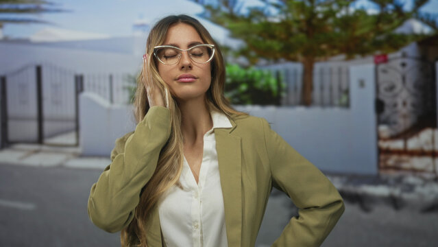 Businesswoman wearing glasses in olive blazer raising hands and tilting head in studio; confusion uncertainty.