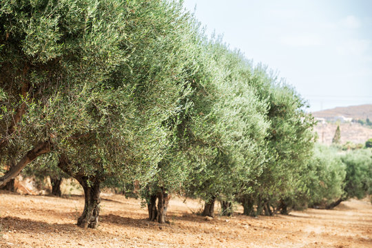 Harvested fresh olives in sacks in a field in Crete, Greece for olive oil production, using green nets.