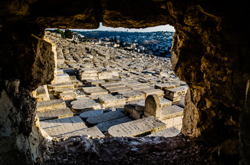 Panoramic view of the Mount of Olives with the most ancient and most important Jewish Cemetery in Jerusalem, Israel. View from the Armon Hanatziv panoramic lookout.